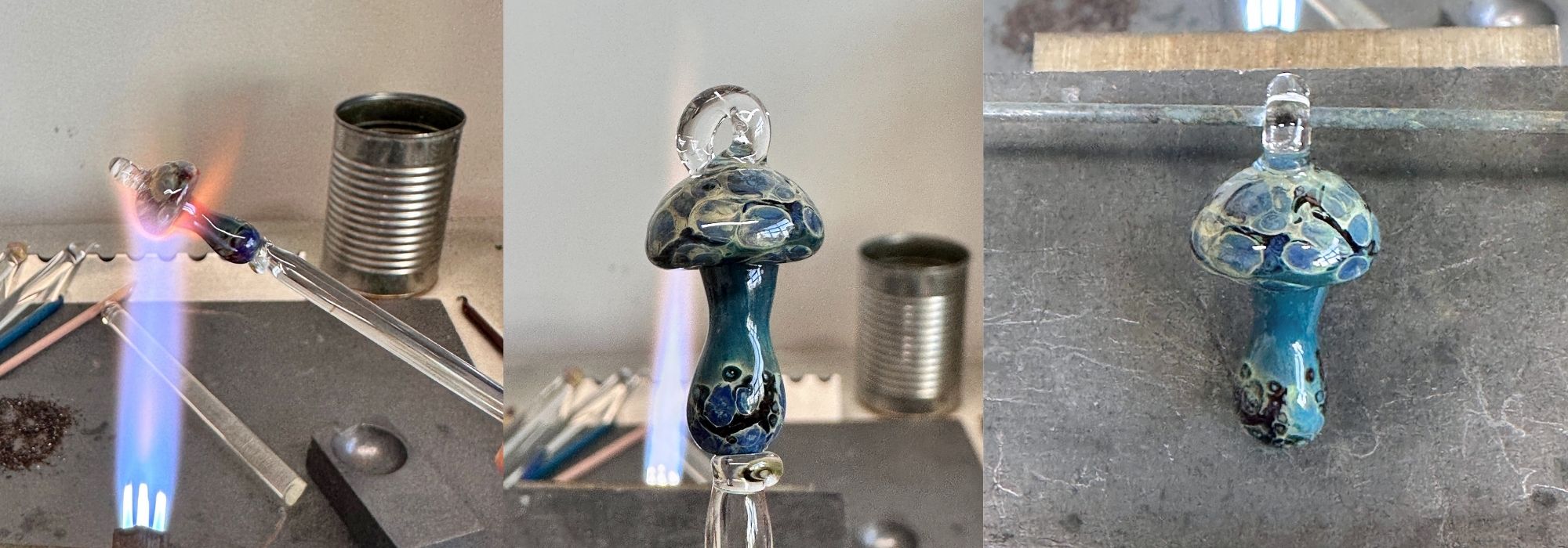 By the end of class, you’ll have created your own sculptural mushroom pendant and a deeper understanding of shaping, balance, and color play in molten glass. This class is a playful and rewarding introduction to sculptural lampworking and the meditative beauty of borosilicate art. The necklace will be finished with a satin cord by the instructor, so it's ready to wear when you pick it up.